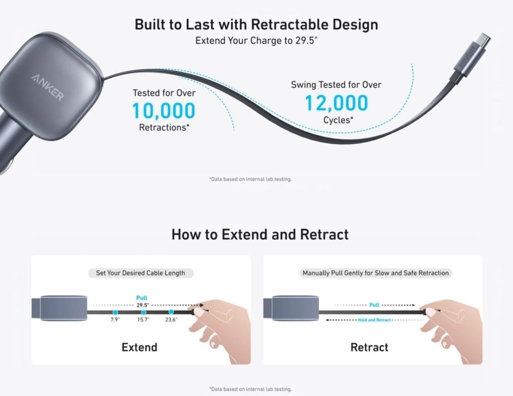 يتميز بتصميم كابل قابل للسحب، حيث يمكن تمديده لأكثر من 2 إنش عند الحاجة، وإعادته بسهولة للحفاظ على ترتيب السيارة دون فوضى.