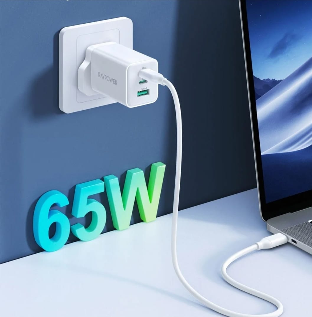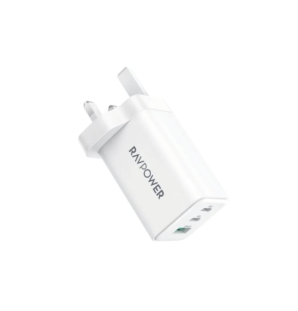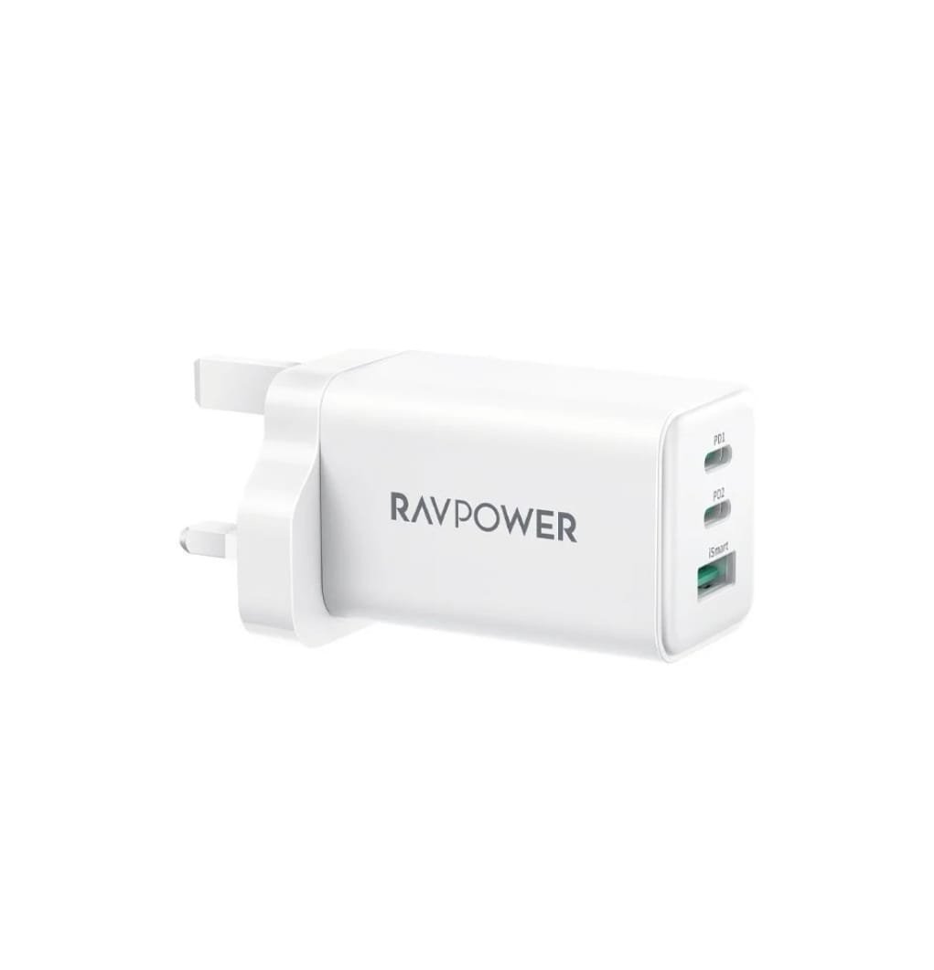 راف باور شاحن جداري بايونير 65 واط منفذين USB-C ومنفذ USB-A بتقنية GaN - ابيض