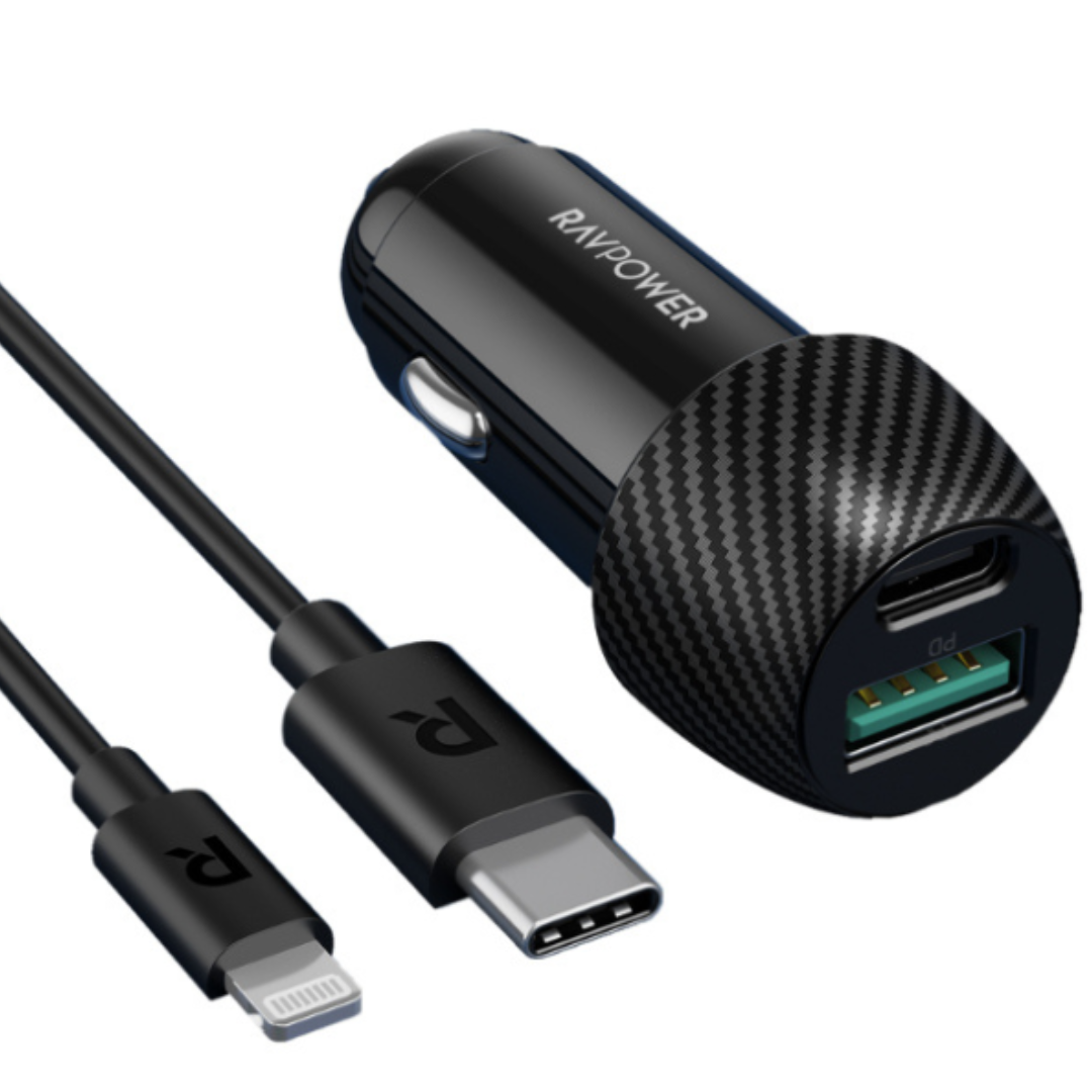 راف باور شاحن سيارة منفذ بي 25واط ومنفذ يو اس بي 24واطكيبل تايب سي الى لايتنينج بي دي بطول 1 متر للايفون14 وماقبلضمان سنتين