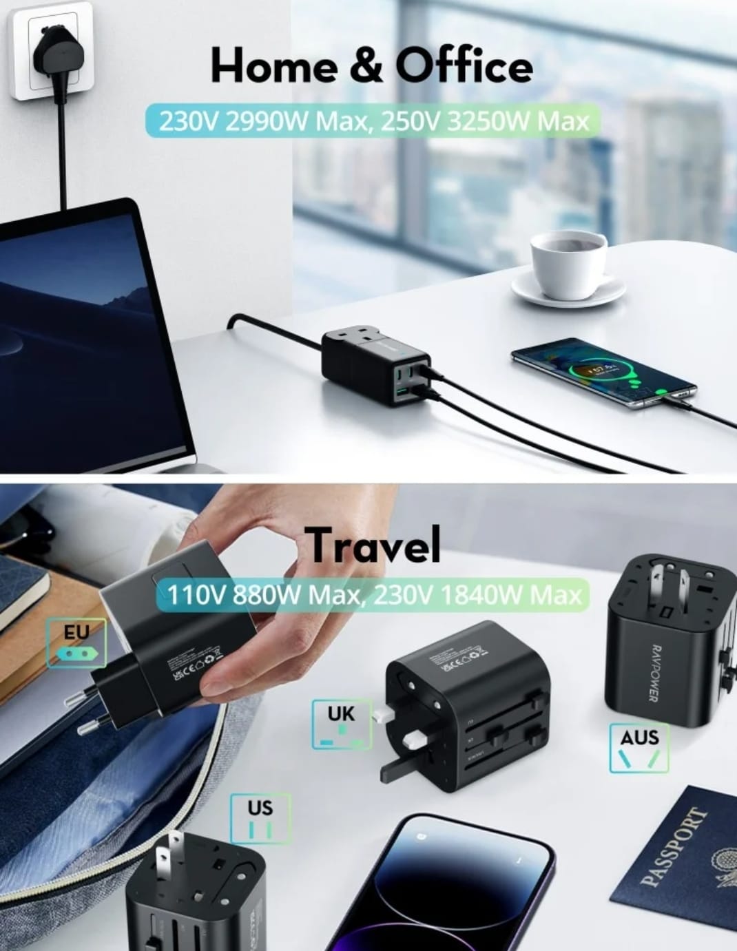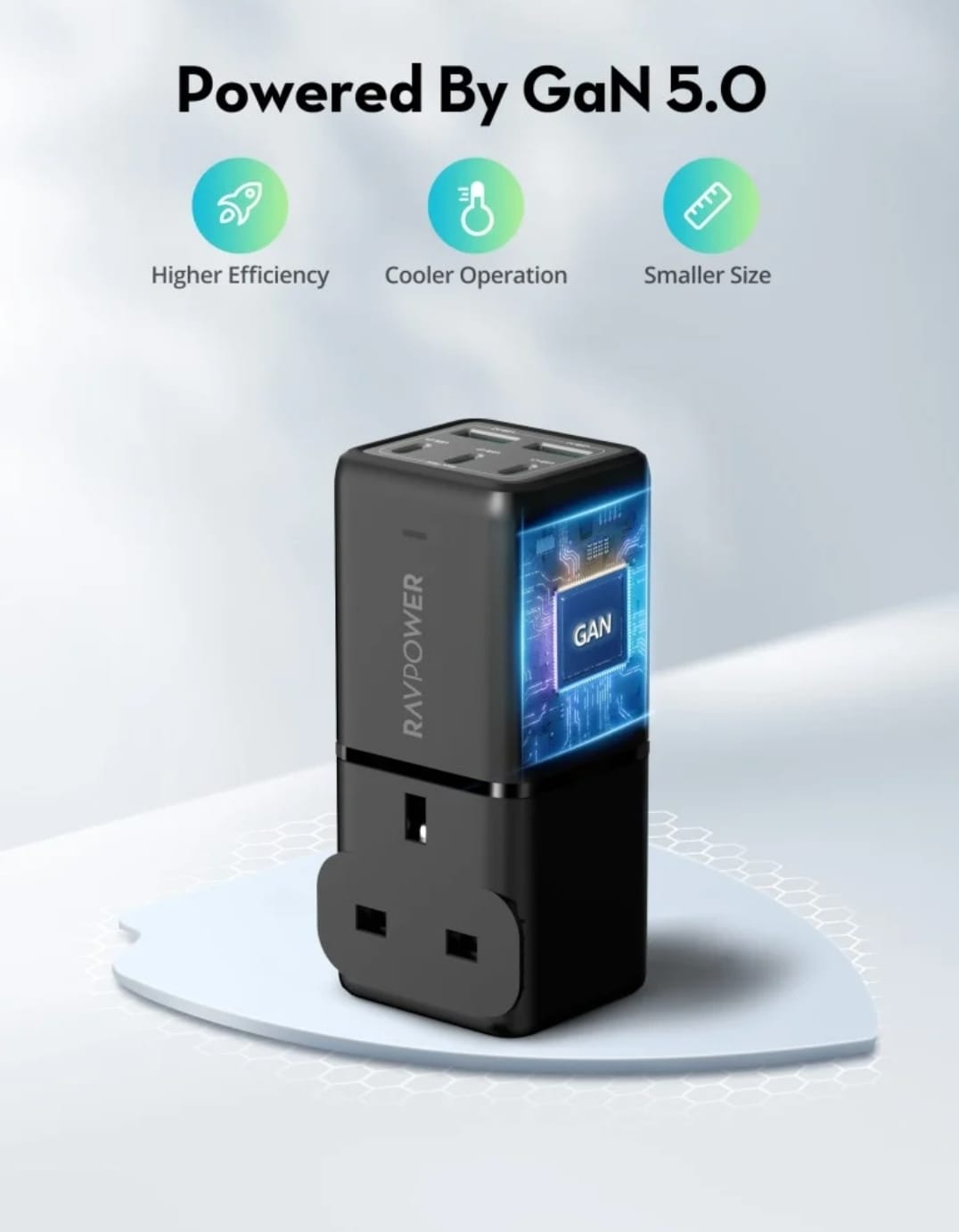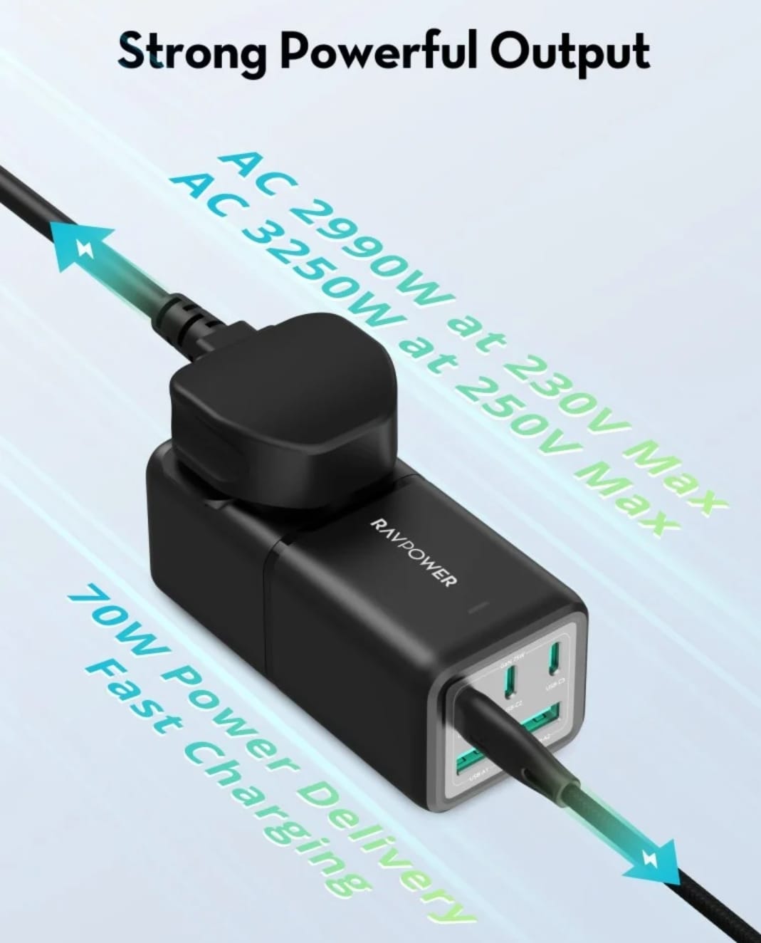 تتميز راف باور منصة شحن تايب سي بثلاثة منافذ عالية الأداء، تتيح شحن اللابتوب والتابلت والهاتف في وقت واحد، المنفذ الأول USB-C1 يوفر حتى 70 واط، والثاني والثالث حتى 30 واط، كما تضم منفذين USB-A بقدرة إجمالية 60 واط لتغطية جميع احتياجاتك، وجود فيش سفر متعدد المداخل يجعلها مثالية للمستخدمين كثيري التنقل، ويوفر مرونة كاملة في الشحن أثناء السفر.