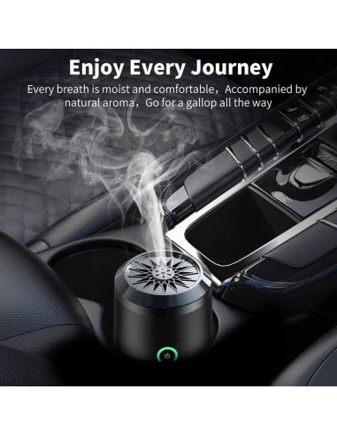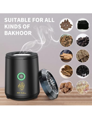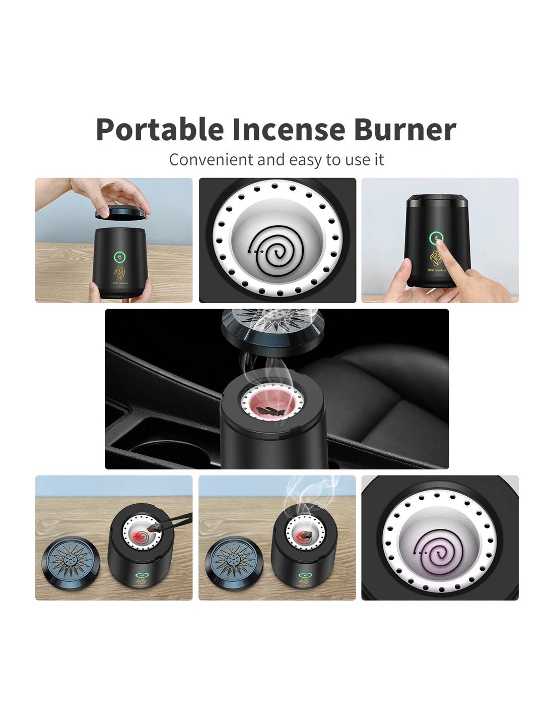 تتمتع المبخرة الذكية الإلكترونية بتصميم دائري مدمج يتّسم بالبساطة والأناقة، مع لون أسود لامع ونقوش ذهبية، حجمها الصغير يجعلها مبخرة عود إلكترونية سهلة الوضع في أي مساحة سواء كانت السيارة، المكتب، أو غرفة الجلوس.