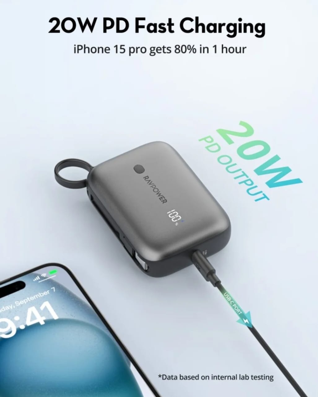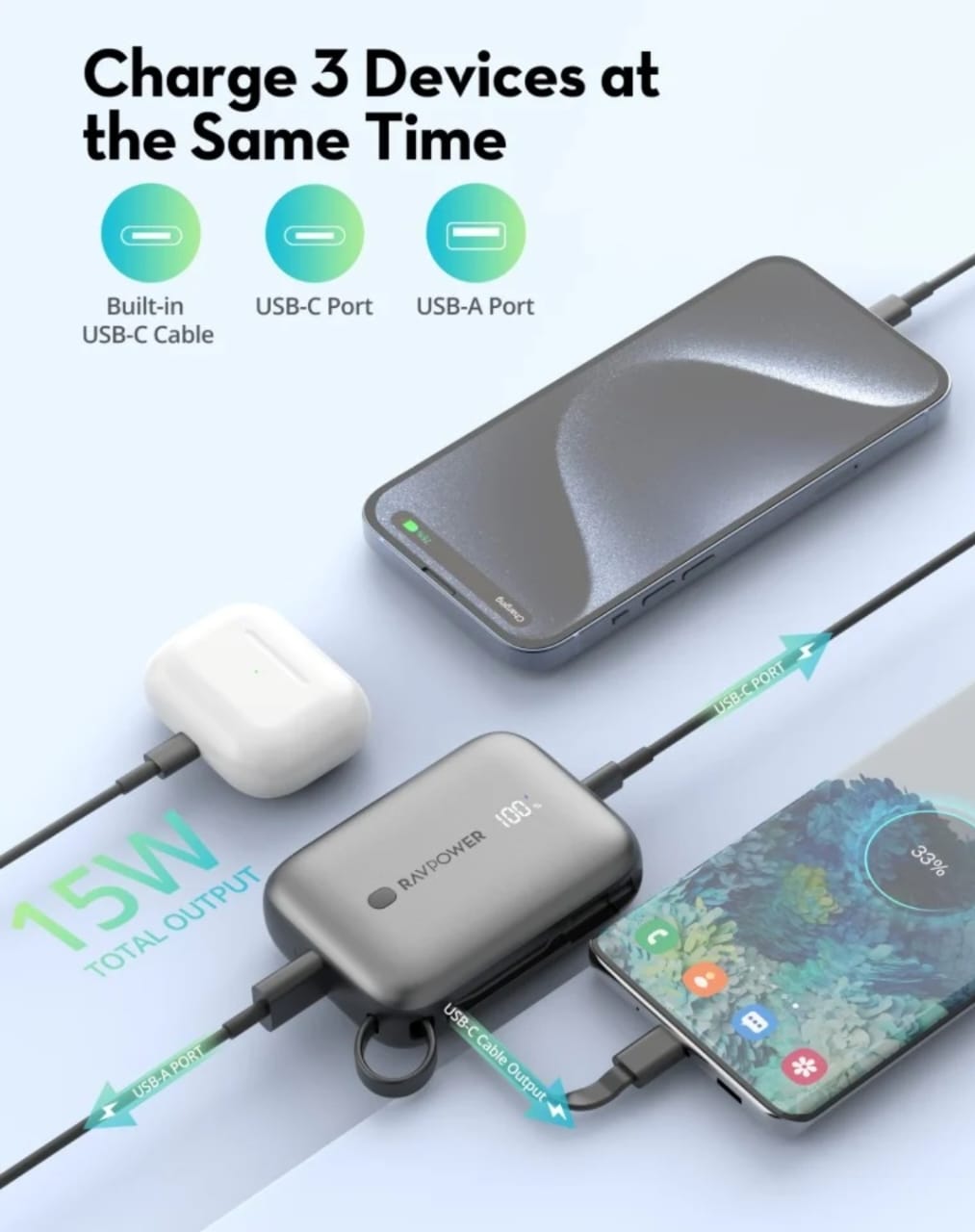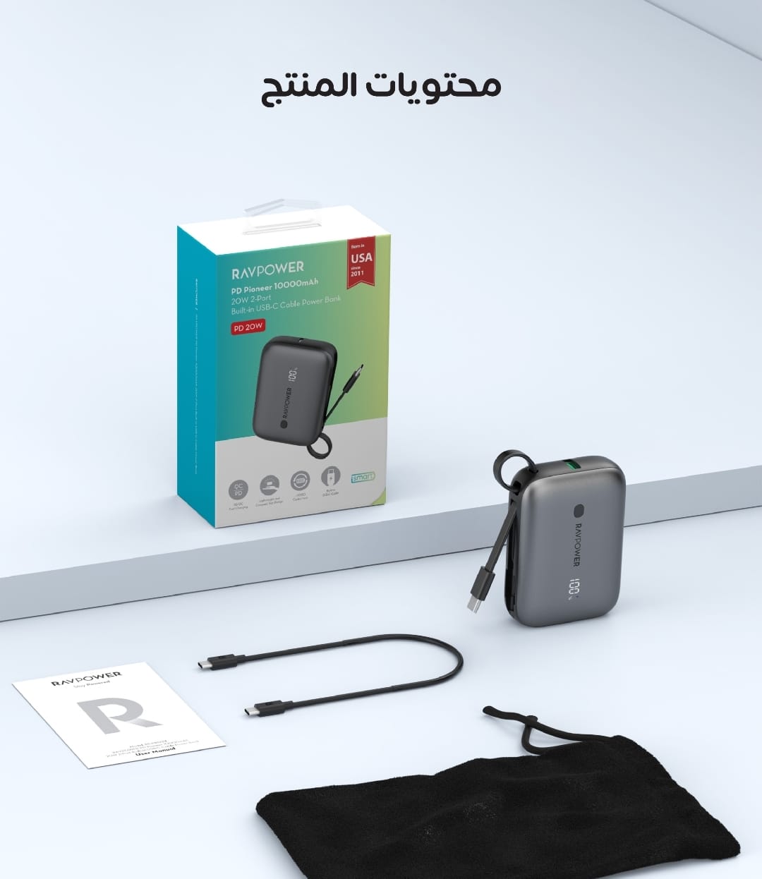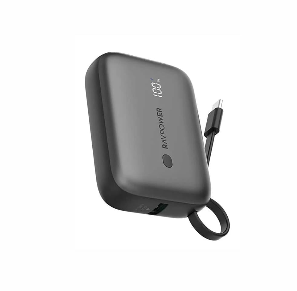 It comes with a built-in USB Type-C cable, providing ease and convenience for use and charging other devices that support this type of port.